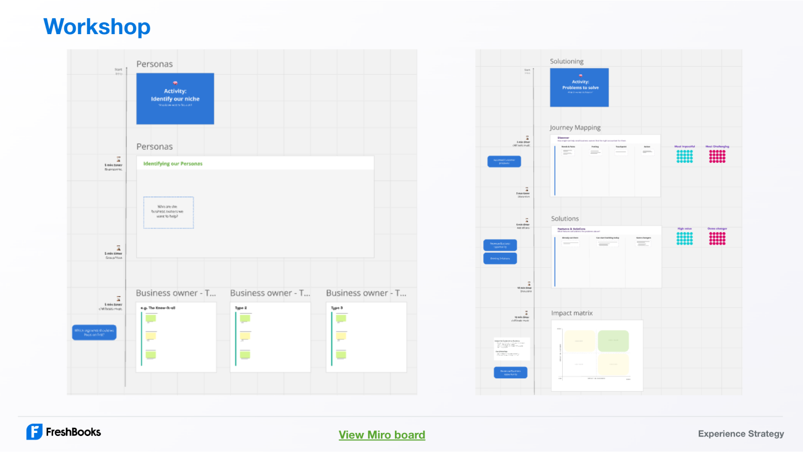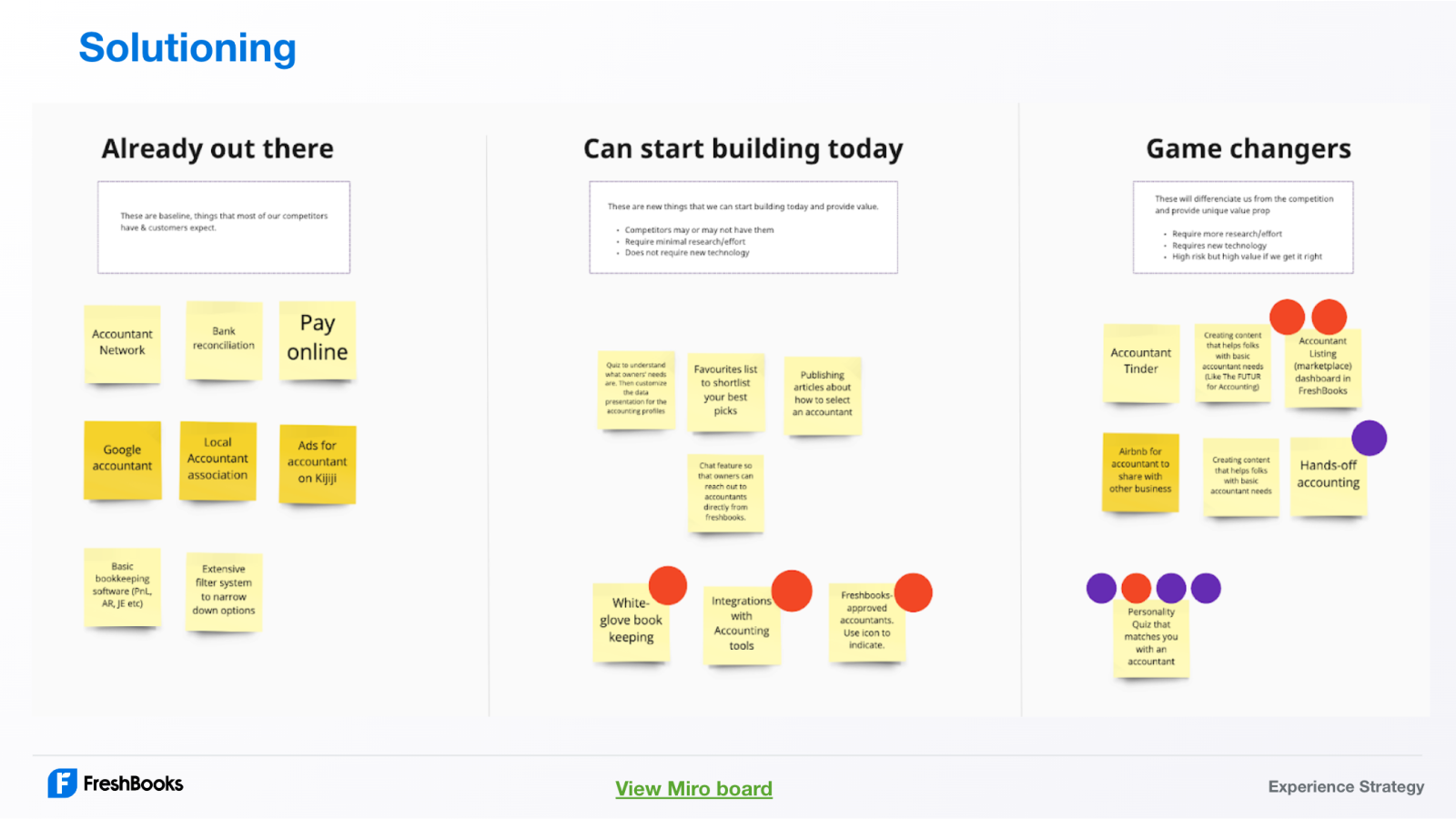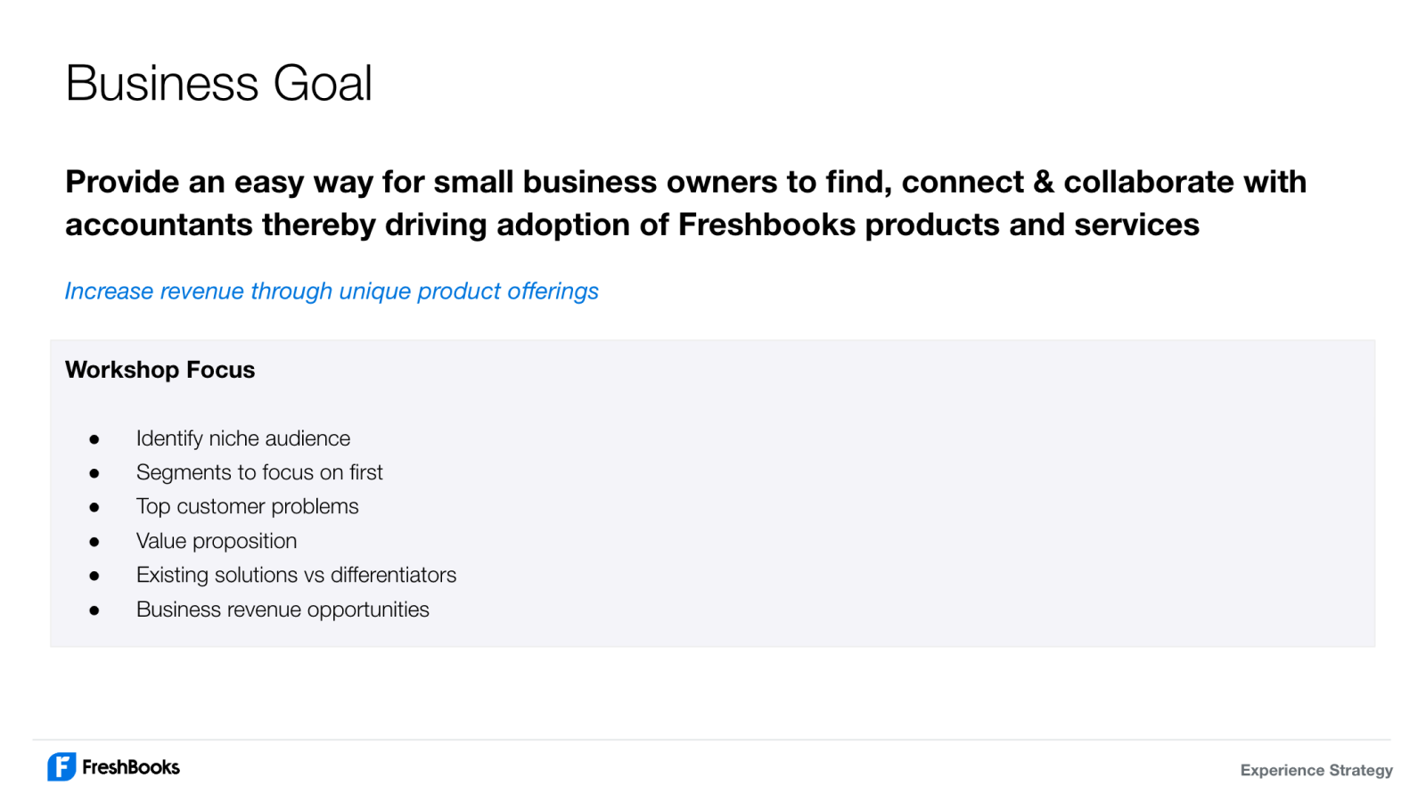 For my first design challenge at FreshBooks, I planned and facilitated a workshop with cross-functional team members to explore how we could help Small Business Owners find and collaborate with the right accounting partner for their unique business goals, across multiple platforms. I presented the outcomes through an engaging narrative.